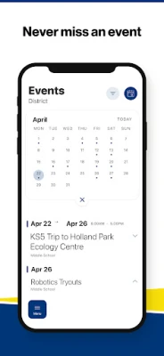 NEVER MISS AN EVENT The event section shows a list of events throughout the district. Users can add an event to their calendar to share the event with friends and family with one tap.