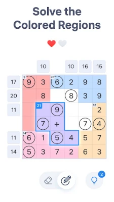 - Each level of these math puzzles has only one possible solution, so make sure that the rows, columns and colored regions work together at the same time.